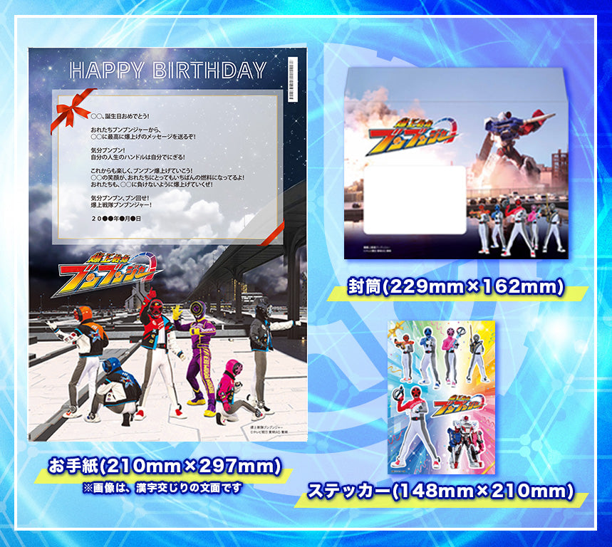 お手紙の文面はブンブンジャーからのメッセージが書かれています。文面はお受け取りになる方の年齢に合わせて「幼児(ひらがな)」と「子供(漢字まじり)」からお選びいただけます。